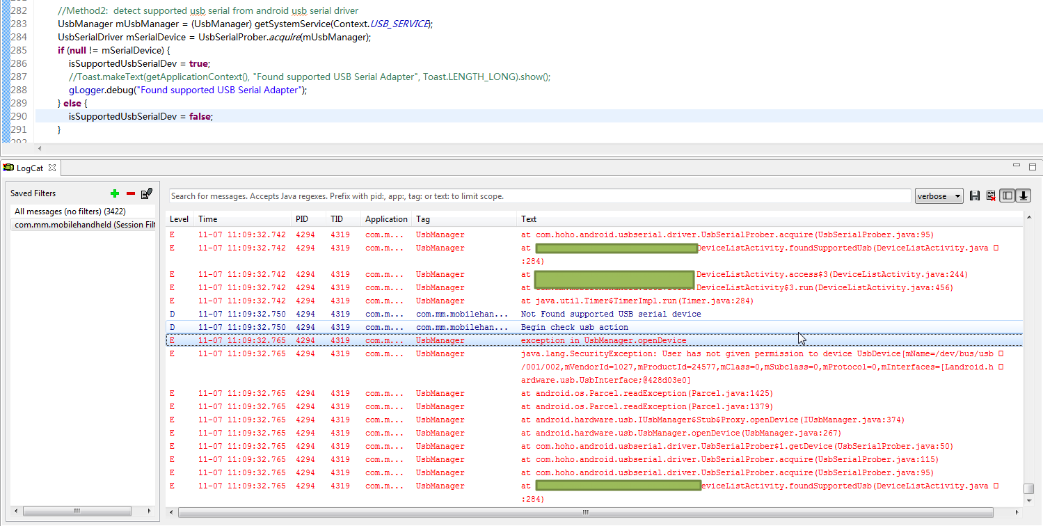 【已解决】android程序运行出错:UsbManager(4294): exception in UsbManager.openDevice,java.lang.SecurityException: User has not given permission to device UsbDevice