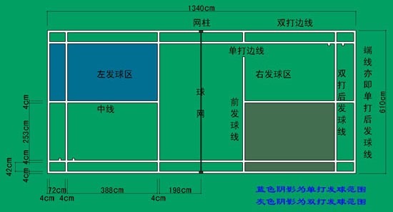 羽毛球场地尺寸 羽毛球单个场地标准尺寸: 单打:长13.40米x宽5.18米 双打:长13.40米x宽6.10米 另外: 网柱:高1.55米 球网: 球...