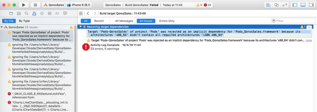 【已解决】Xcode编译警告:Target of project Pods was rejected as an implicit dependency for because its architectures x86_64 didn’t contain all required architectures i386 x86_64