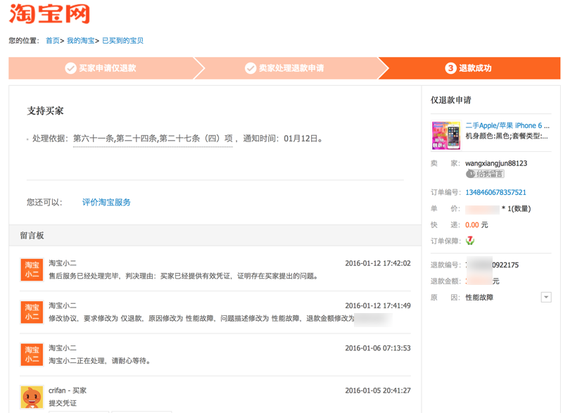 淘宝网系统登录后,看到的这个订单,是:退款成功