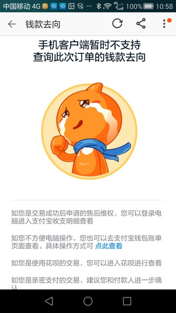 去手机淘宝中,去查看钱款去向,结果没有查到,只有看到说明: