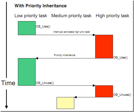 当A被阻塞,要去调度,即使存在另一个中优先级任务B,则也可以实现: