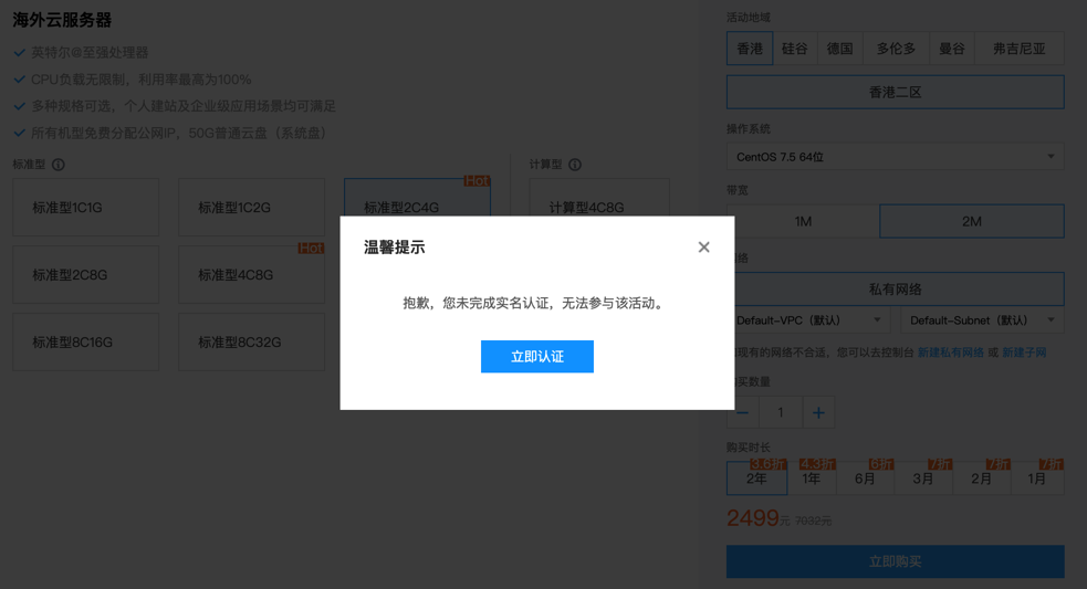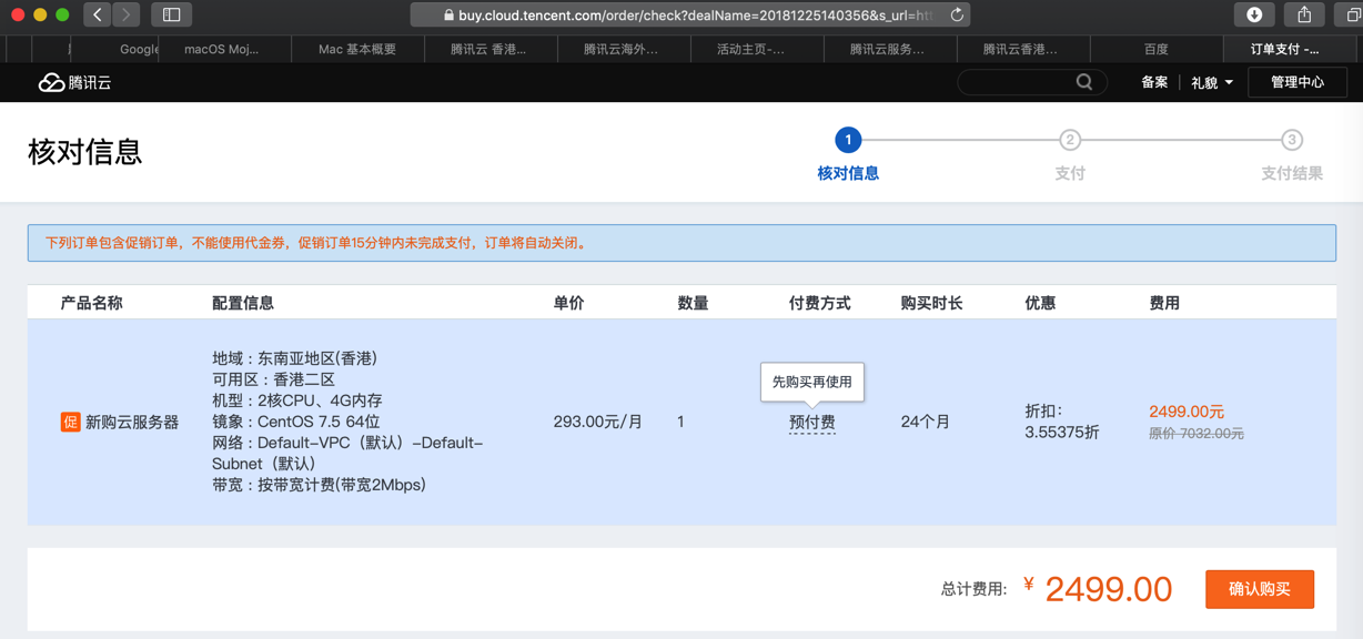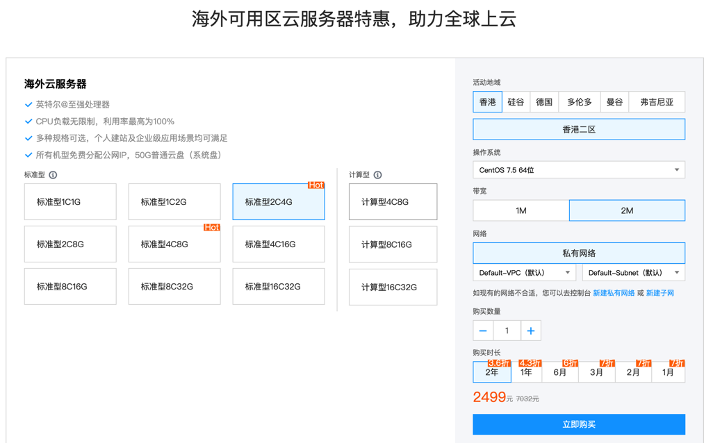 <code>产品名称 配置信息 单价 数量 付费方式 购买时长 优惠 费用 新购云服务器 地域 : 东南亚地区(香港) 可用区 : 香港二区 机型 : 2核CPU、4G内存 镜象 : CentOS 7.5 64位 网络 : Default-VPC(默认)-Default-Subnet(默认) 带宽 : 按带宽计费(带宽2Mbps) 293.00元/月 1 预付费 24个月 折扣:3.55375折 2499.00元 原价 7032.00元 </code>