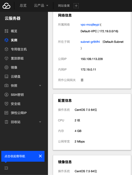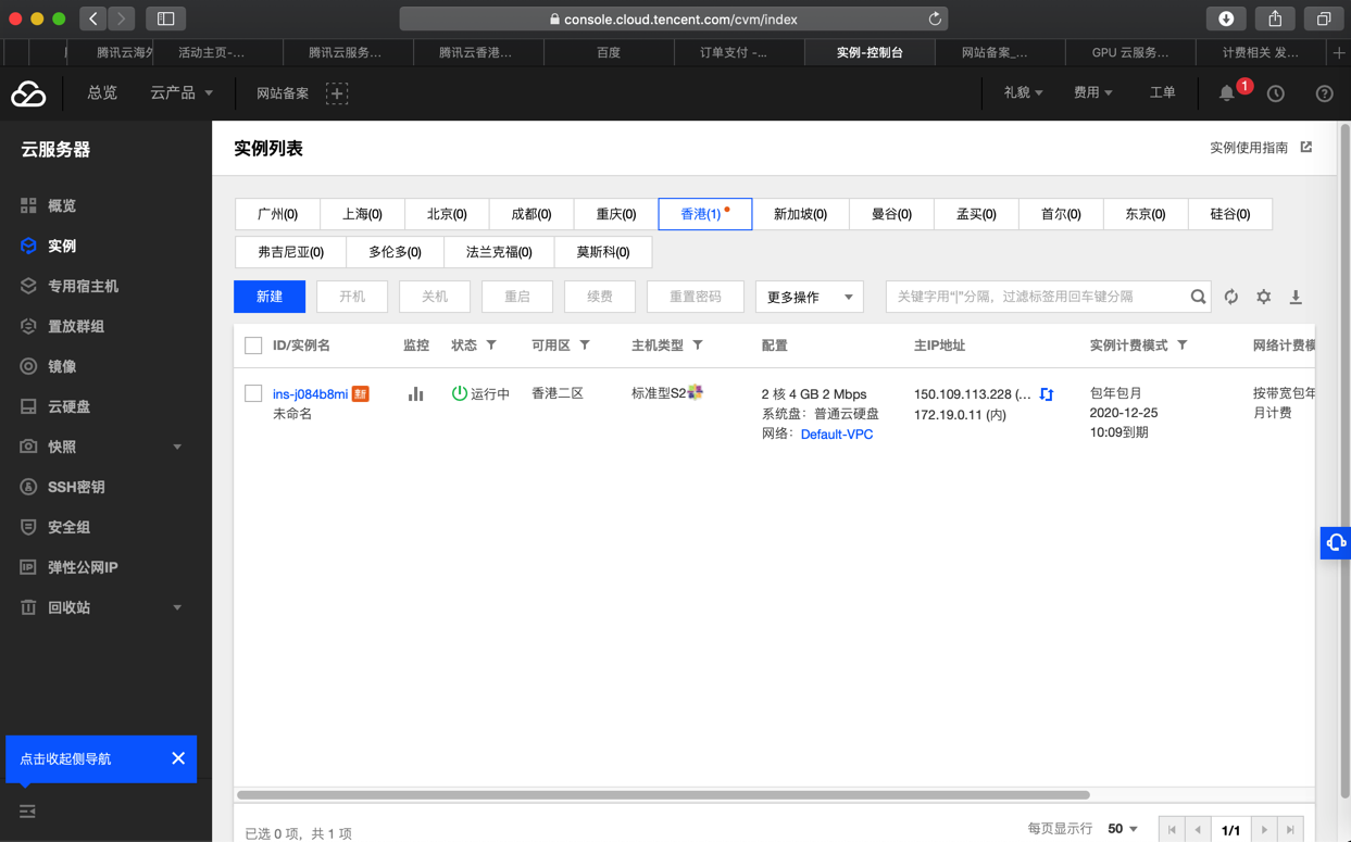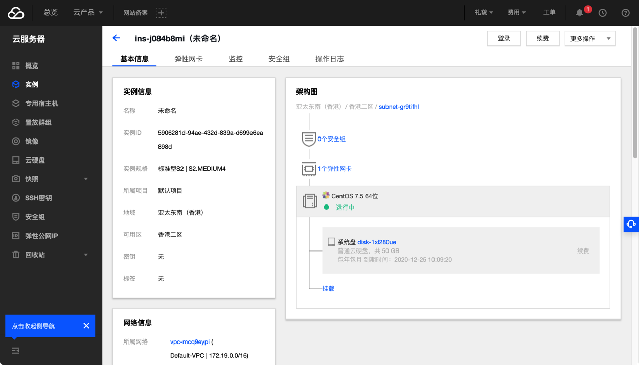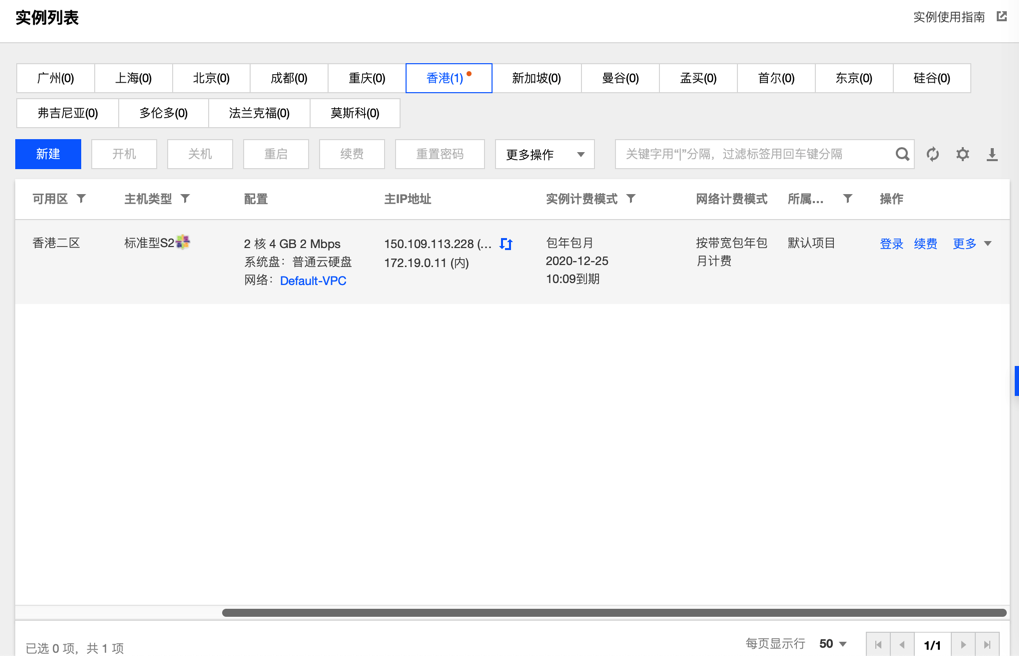 <code>ID/实例名 监控 状态 可用区 主机类型 配置 主IP地址 实例计费模式 网络计费模式 所属项目 操作 ins-j084b8mi 未命名 监控 运行中 香港二区 标准型S2 2 核 4 GB 2 Mbps 系统盘:普通云硬盘 网络:Default-VPC 150.109.113.228 (公) 172.19.0.11 (内) 包年包月 2020-12-25 10:09到期 按带宽包年包月计费 默认项目 登录 续费 更多 </code>