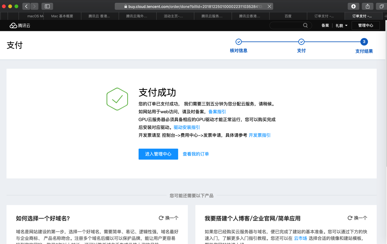 <code>支付成功 您的订单已支付成功, 我们需要三到五分钟为您分配云服务,请稍候。如网站用于web访问,请及时备案,备案指引 GPU云服务器必须具备相应的GPU驱动才能正常运行,您可以购买完成后安装对应驱动。驱动安装指引 开发票请至 控制台->费用中心->发票申请,具体请参考 开发票指引 进入管理中心 查看我的订单 </code>