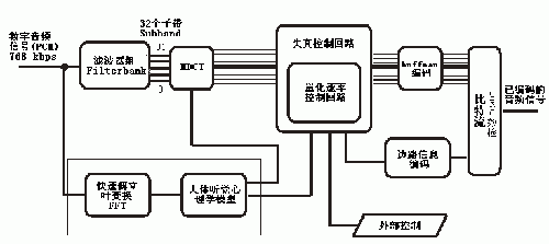 数字音频信号以脉冲的形式送进编码器,首先会经过一滤波器段(filterbank),它由两个串联的滤波器段组成:一个多相分析滤波器段和一个MDCT(Modified Discrete Cosine Transform,经改良的离散余弦转换),前者也应用到layer-1和layer-2中,后者是MP3独有的。