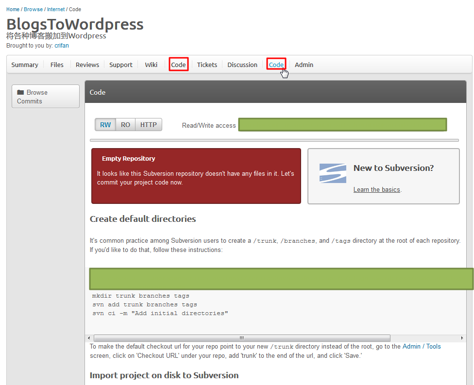 此处,看了下,发现,由于之前手动把SVN也加到SourceForge的项目中了,导致顶端出现两个code,其中第二个才是svn的: