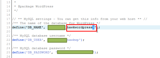 结果诡异的发现,之前配置好的,DB_NAME本来是xxx_hawkwordpress的,现在不知道为何却变成了: