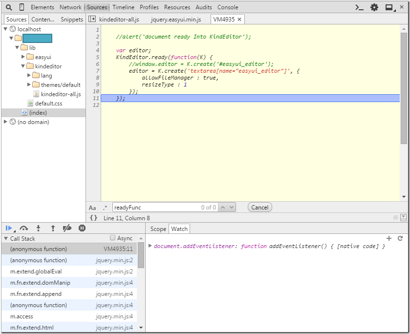 Chrome->F12->Source->Source->此处的localhost/schoolike/lib/kindeditor/kindeditor-all.js