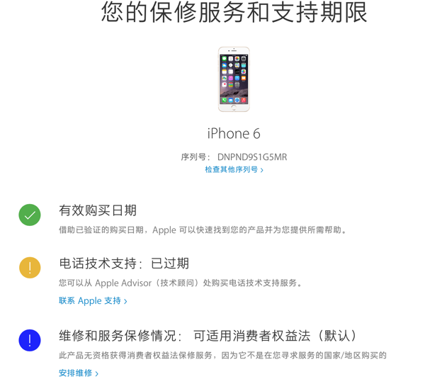 iPhone 6 序列号: DNPND9S1G5MR 检查其他序列号 有效购买日期 借助已验证的购买日期,Apple 可以快速找到您的产品并为您提供所需帮助。 电话技术支持:已过期 您可以从 Apple Advisor(技术顾问)处购买电话技术支持服务。 联系 Apple 支持 维修和服务保修情况: 可适用消费者权益法(默认) 此产品无资格获得消费者权益法保修服务,因为它不是在您寻求服务的国家/地区购买的 安排维修 如果您认为针对您的产品所显示的信息不正确,可以在线提交您的购买凭证在新窗口中打开。Apple 有限保修、AppleCare Protection Plan 全方位服务计划和 AppleCare+ 验证需要用到您的销售收据,因此请务必将它放在一个安全的地方。无论您是否注册,Apple 的有限保修都是相同的。 重要信息:Apple 有限保修、AppleCare Protection Plan 全方位服务计划和 AppleCare+ 的权益是对消费者权益法所赋予权利的补充(查看详情Apple 产品和消费者合法权益)。如果您认为自己援引的消费者权益法合理,请联系我们。 进一步了解在新窗口中打开您的保修期限或估计的原始销售日期。 |