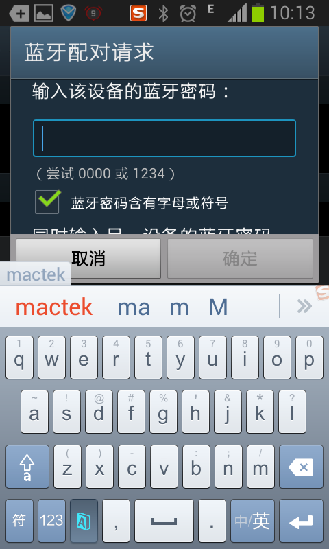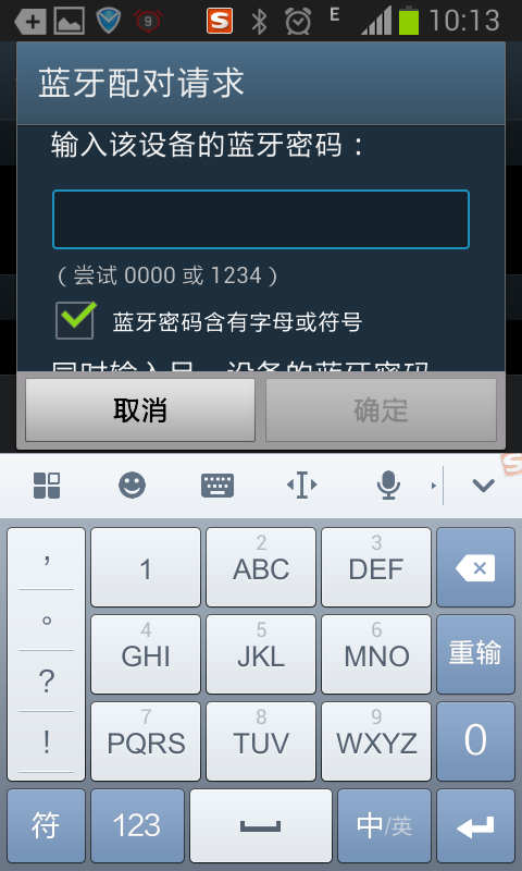 此时,默认只能输入数字,而我们的索要配对的蓝牙设备的密码是字母,