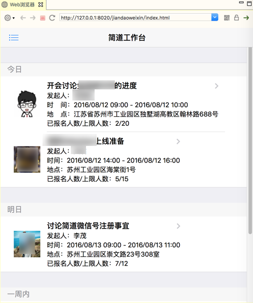 <!DOCTYPE html> <html> <head> <meta charset="utf-8"> <meta name="viewport" content="width=device-width, initial-scale=1, maximum-scale=1, minimum-scale=1, user-scalable=no, minimal-ui"> <meta name="apple-mobile-web-app-capable" content="yes"> <meta name="apple-mobile-web-app-status-bar-style" content="black"> <title>简道工作台</title> <!– Path to Framework7 Library CSS–> <!–<link rel="stylesheet" href="css/framework7.ios.min.css"> <link rel="stylesheet" href="css/framework7.ios.colors.min.css"> –> <link rel="stylesheet" href="css/framework7.ios.css"> <link rel="stylesheet" href="css/framework7.ios.colors.css"> <!– Path to your custom app styles–> <link rel="stylesheet" href="css/my-app.css"> </head> <body> <!– Status bar overlay for fullscreen mode–> <div class="statusbar-overlay"></div> <!– Panels overlay–> <div class="panel-overlay"></div> <!– Right panel with cover effect–> <div class="panel panel-left panel-reveal"> <div class="content-block"> <p>工作台</p> <div class="list-block"> <ul> <li class="item-content"> <div class="item-media"> <i class="icon icon-form-gender"></i> </div> <div class="item-inner"> <div class="item-title">任务</div> <div class="item-after"><span class="badge">8</span></div> </div> </li> <li class="item-content"> <div class="item-media"> <i class="icon icon-form-comment"></i> </div> <div class="item-inner"> <div class="item-title">日程</div> <div class="item-after"><span class="badge">3</span></div> </div> </li> <li class="item-content"> <div class="item-media"> <i class="icon icon-form-settings"></i> </div> <div class="item-inner"> <div class="item-title">设置</div> </div> </li> </ul> </div> </div> </div> <!– Views–> <div class="views"> <!– Your main view, should have "view-main" class–> <div class="view view-main"> <!– Top Navbar–> <div class="navbar"> <div class="navbar-inner"> <div class="left"> <a href="#" class="link icon-only open-panel"> <i class="icon icon-bars"></i></a> </div> <!– We have home navbar without left link–> <div class="center sliding">简道工作台</div> <!– <div class="right"> –> </div> </div> <!– Pages, because we need fixed-through navbar and toolbar, it has additional appropriate classes–> <div class="pages navbar-through toolbar-through"> <!– Page, data-page contains page name–> <div data-page="index" class="page"> <!– Scrollable page content–> <div class="page-content"> <div class="list-block"> <div class="list-group"> <div class="list-block media-list"> <!–<div class="list-block">–> <ul> <li class="list-group-title">今日</li> <li> <a href="#" class="item-link item-content"> <div class="item-content"> <div class="item-media"> <img class="initiator-avatar" src="img/avatar/zhouhaixiao.jpg"> </div> <div class="item-inner"> <div class="item-title-row"> <div class="item-title">开会讨论金鸡湖日历的进度</div> <!– <div class="item-after”>xxx</div> –> </div> <div class="item-subtitle">发起人:xxx</div> <div class="item-subtitle">时 间:2016/08/12 09:00 – 2016/08/12 10:00</div> <!–<div class="item-text">希望相关人员都参与,以便于头脑风暴,讨论出日历的基本功能,以及基本的原型,便于展开后续的工作</div>–> <div class="item-subtitle">地 点:江苏省苏州市工业园区独墅湖高教区翰林路688号</div> <div class="item-subtitle">已报名人数/上限人数:2/20</div> </div> </div> </a> </li> <li> <a href="#" class="item-link item-content"> <div class="item-content"> <div class="item-media"> <img class="initiator-avatar" src="img/avatar/wutao.jpg"> </div> <div class="item-inner"> <div class="item-title-row"> <div class="item-title”>asdgg上线准备</div> </div> <div class="item-subtitle">发起人:yy</div> <div class="item-subtitle">时间:2016/08/12 14:00 – 2016/08/12 16:00</div> <!–<div class="item-text">一起看看,在正式上线发布时候需要准备哪些东西,包括购买消息推送</div>–> <div class="item-subtitle">地点:苏州工业园区海棠街1号</div> <div class="item-subtitle">已报名人数/上限人数:5/15</div> </div> </div> </a> </li> </ul> </div> </div> <div class="list-group"> <div class="list-block media-list"> <ul> <li class="list-group-title">明日</li> <li> <a href="#" class="item-link item-content"> <div class="item-content"> <div class="item-media"> <img class="initiator-avatar" src="img/avatar/limao.jpg"> </div> <div class="item-inner"> <div class="item-title-row"> <div class="item-title">讨论简道微信号注册事宜</div> </div> <div class="item-subtitle">发起人:李茂</div> <div class="item-subtitle">时间:2016/08/13 09:00 – 2016/08/13 11:00</div> <!–<div class="item-text">开始讨论和折腾简道微信号注册事宜</div>–> <div class="item-subtitle">地点:苏州工业园区崇文路23号308室</div> <div class="item-subtitle">已报名人数/上限人数:7/12</div> </div> </div> </a> </li> </ul> </div> </div> <div class="list-group"> <div class="list-block media-list"> <ul> <li class="list-group-title">一周内</li> <li> <a href="#" class="item-link item-content"> <div class="item-content"> <div class="item-media"> <img class="initiator-avatar" src="img/avatar/liyuanfei.jpg"> </div> <div class="item-inner"> <div class="item-title-row"> <div class="item-title">讨论日历的公众号名字</div> </div> <div class="item-subtitle">发起人:www</div> <div class="item-subtitle">时间:2016/08/20 15:00 – 2016/08/20 18:00</div> <!–<div class="item-text">头脑风暴一起起一个好记又形象的公众号名字</div>–> <div class="item-subtitle">地点:苏州工业园区林泉街399号东南大学国家科技园苏州南工院305室</div> <div class="item-subtitle">已报名人数/上限人数:1/5</div> </div> </div> </a> </li> </ul> </div> </div> </div> </div> </div> </div> </div> </div> <!– Path to Framework7 Library JS–> <script type="text/javascript" src="js/framework7.min.js"></script> <!– Path to your app js–> 