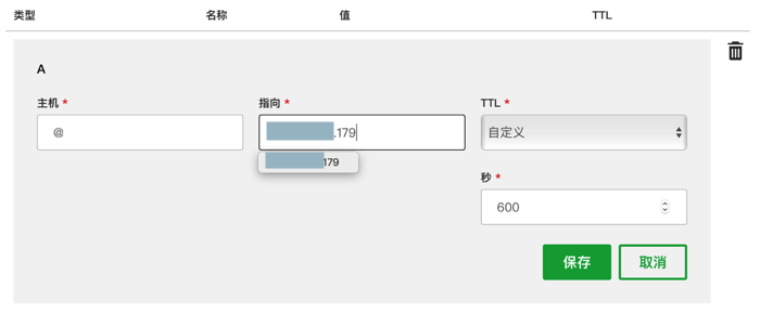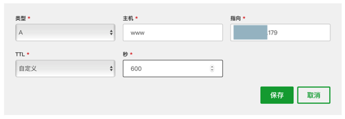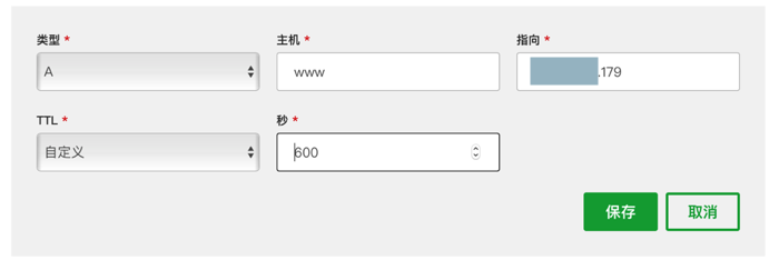 A 记录将您的域名指向使用某个 IP 地址的单个服务器。 一个 IP 地址的样本是 123.4.67.5。