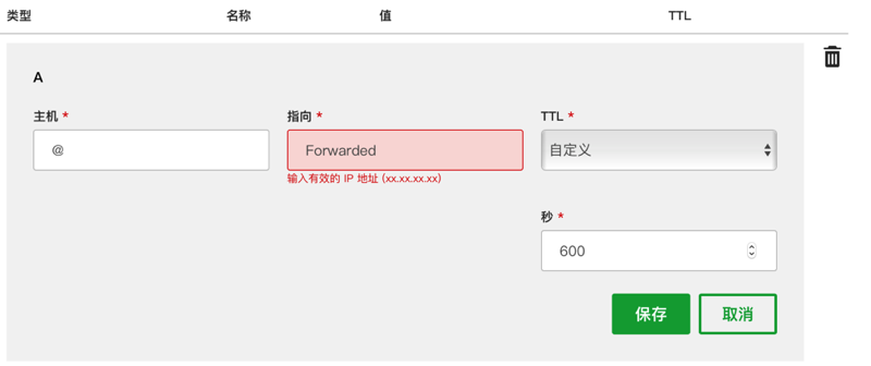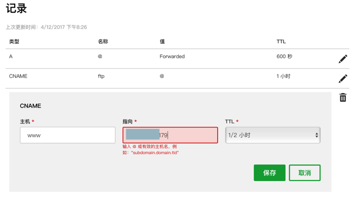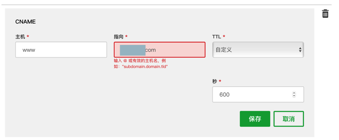 输入 @ 或有效的主机名,例如:”subdomain.domain.tld”