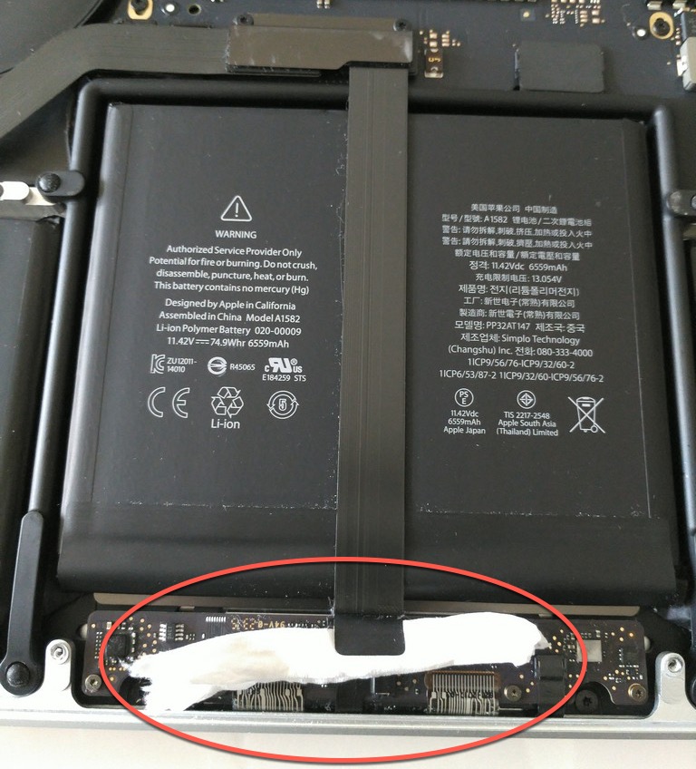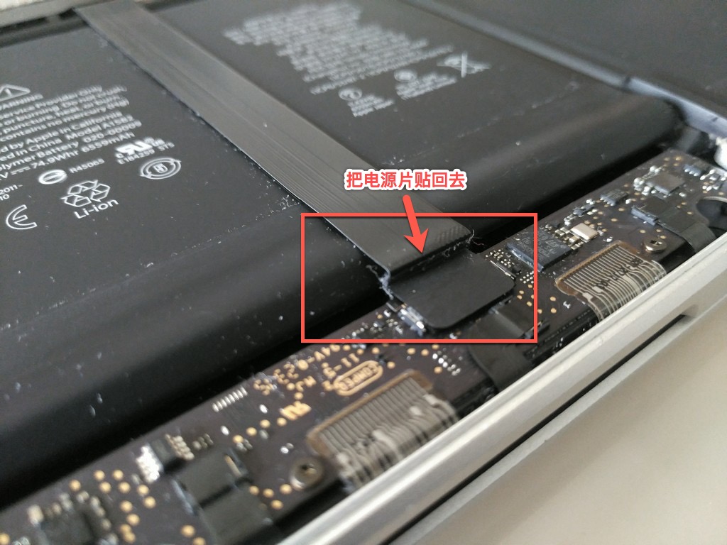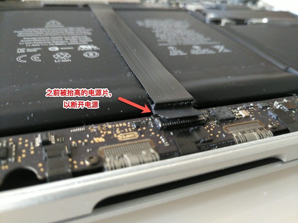 (1)电源片的位置,和我此处的A1502的Macbook不太一样,还是参考前面的教程,稍微拔起来一点,就可以了。