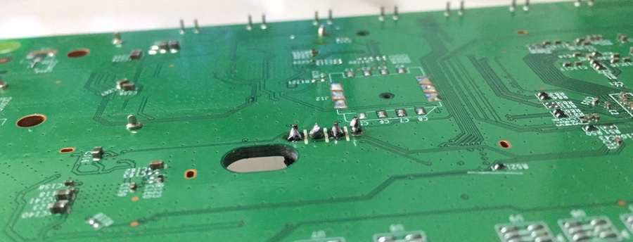 这时候我们就要把多余的锡给去除,我们可以用到吸锡器(利用吸力将融化的锡吸走),也可以用到吸锡带(利用铜线吸锡),如果手头没有这两种工具的话,我们还可多加松香,使焊锡流动性增强,用烙铁一点一点把焊点上的锡移除(加松香使焊点融锡,然后把烙铁头上的锡用海绵擦干净,再加松香融锡,重复上述操作,即可将焊点上多余的锡去除)。