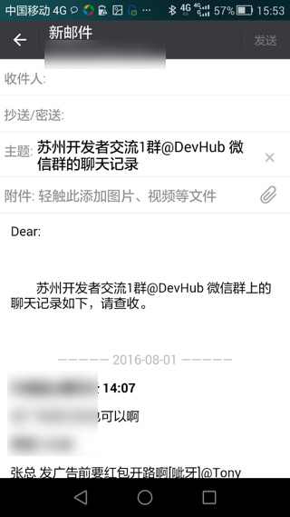 主题:讨论组的名字 + 的聊天记录 邮件内容: Dear, xxx微信群上的聊天记录,请查收。 ---年-月-日---- 用户1 发送时间: 用户1的内容 用户2 发送时间: 用户2的内容 。。。 |