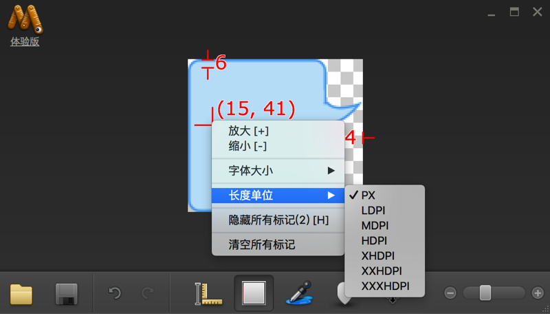 拖动了张图片:然后点击那个长度标记,默认是垂直的,再次点击变成水平方向的:然后点击到图片中默认是20宽度:再去拖动即可达到需要的尺寸:还可以标记坐标范围:转载请注明:在路上 » [记录]使用马克鳗MarkMan进行图片尺寸标记 Post Views: 1,512