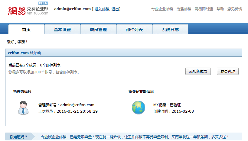 管理员信息 免费企业邮信息 管理员帐号:[email protected] 上次登录:2016-02-03 16:46:57 MX记录:验证中 正确的mx记录:mx.ym.163.com 创建时间:2016-02-03 |