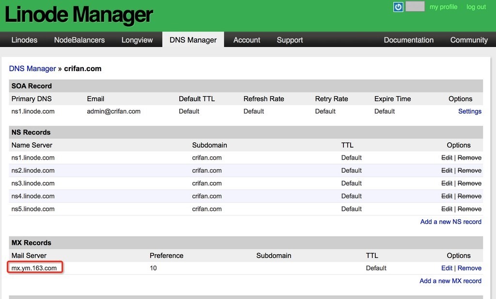 结果没找到MX设置,只看到了DNS是Linode的服务器: