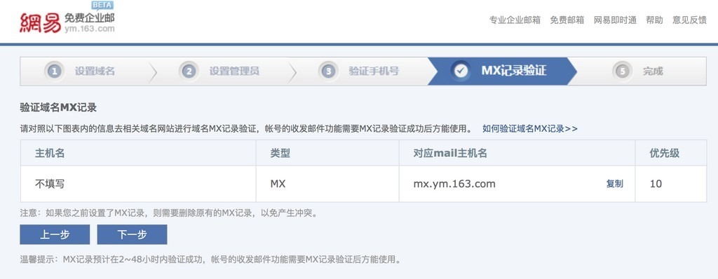 验证域名MX记录 请对照以下图表内的信息去相关域名网站进行域名MX记录验证,帐号的收发邮件功能需要MX记录验证成功后方能使用。如何验证域名MX记录>> 主机名 类型 对应mail主机名 优先级 不填写 MX mx.ym.163.com复制 10 注意:如果您之前设置了MX记录,则需要删除原有的MX记录,以免产生冲突。 上一步下一步 温馨提示:MX记录预计在2~48小时内验证成功,帐号的收发邮件功能需要MX记录验证后方能使用。 |