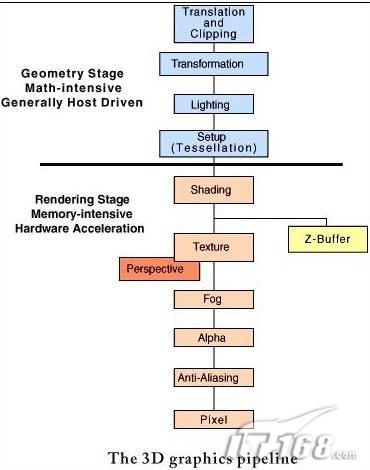“管线”的全称应该是“图形渲染管线”。它好像是工厂的流水线一样,按照不同的生产指令来产生3D图形。通俗一点来讲,一条完整的渲染管线应该是可以独立完成图形渲染任务的所有处理单元的总合。所以管线的定义需要配合相应的API(应用软件接口程序)来进行,不同的API程序对管线的要求也是不尽相同的。以我们最常见的DirectX程序为例,一条管线包括顶点渲染引擎、像素渲染引擎、光栅化引擎三个部分。
