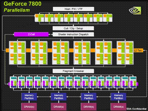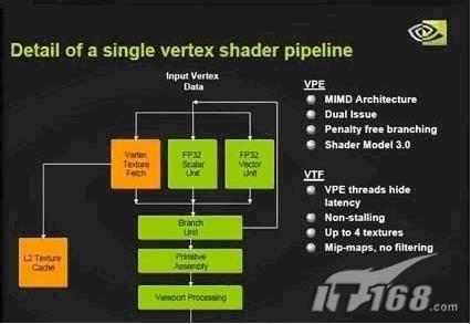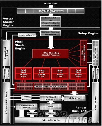DirectX 8时代,VS、PS、POP单元是1:1:1的关系,即完整的管线在一次处理过程中,必须要经过VS、PS、ROP单元的处理。但是,目前主流的DirectX 9中,这一比例被打破,但最基本的图形处理过程仍旧没有本质的变化。 知道了一条最基本的图形渲染管线的组成之后,我们大概了解到一个GPU最少应该具有一条完整的渲染管线,但是我们都知道,现在DirectX 9的环境下,一条管线很难完成图形渲染的需要,于是多条管线并行处理的结构诞生了。多管线结构带来的优点就是:工作效率显著提高,所以高端显卡的管线数量要明显多于入门级显卡,比如GeForce7900GT拥有24条管线,而GeForce 7300GT只有8条管线。