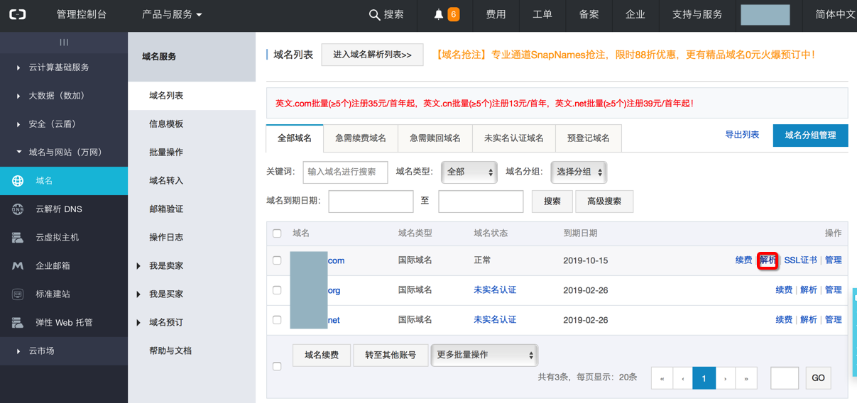 https://netcn.console.aliyun.com/core/domain/list?spm=5176.2020520001.aliyun_sidebar.30.Chcamc