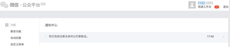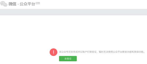 该公众号还未完成对公账户打款验证,暂时无法使用公众平台群发功能和高级功能。