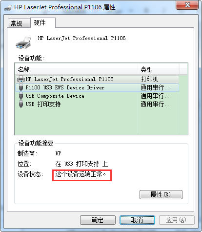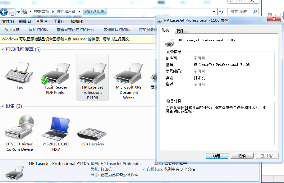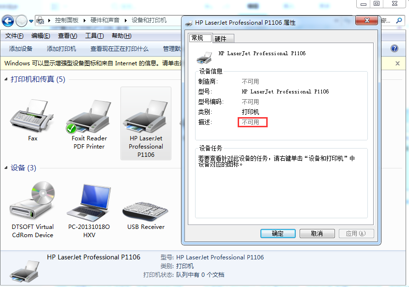 即便此刻打印机可用,但是实际上在Windows的打印机设备里面看到的,还是P1106不可用: