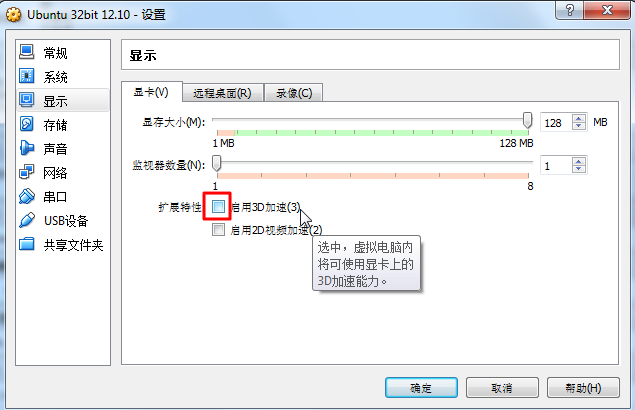 关闭3D加速,Ubuntu太卡了。。。。太慢了。。。。