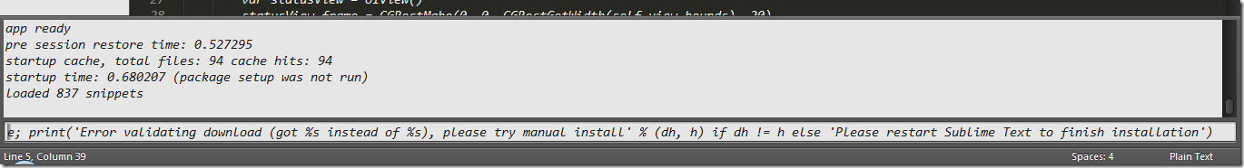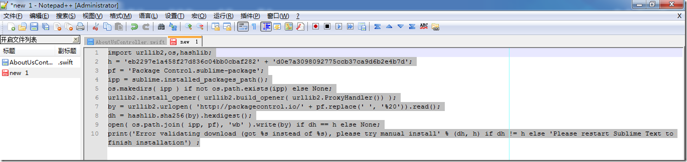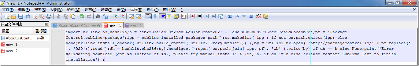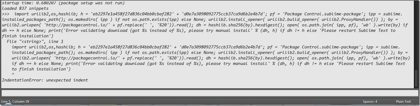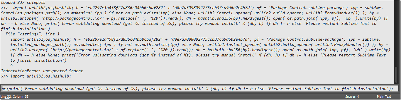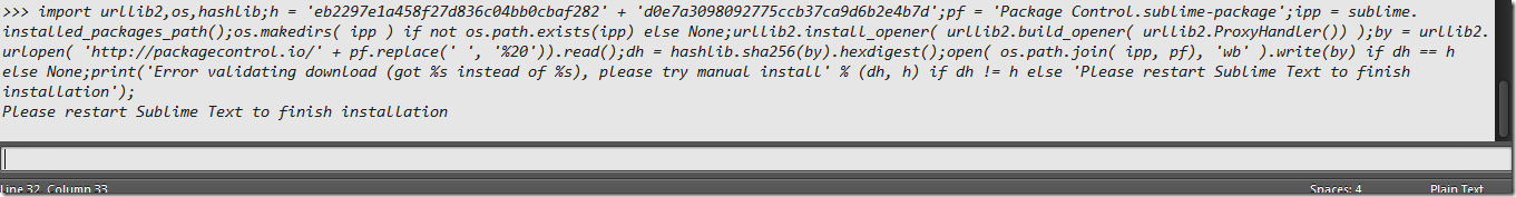 import urllib2,os,hashlib;h = 'eb2297e1a458f27d836c04bb0cbaf282' + 'd0e7a3098092775ccb37ca9d6b2e4b7d';pf = 'Package Control.sublime-package';ipp = sublime.installed_packages_path();os.makedirs( ipp ) if not os.path.exists(ipp) else None;urllib2.install_opener( urllib2.build_opener( urllib2.ProxyHandler()) );by = urllib2.urlopen( 'http://packagecontrol.io/' + pf.replace(' ', '%20')).read();dh = hashlib.sha256(by).hexdigest();open( os.path.join( ipp, pf), 'wb' ).write(by) if dh == h else None;print('Error validating download (got %s instead of %s), please try manual install' % (dh, h) if dh != h else 'Please restart Sublime Text to finish installation');