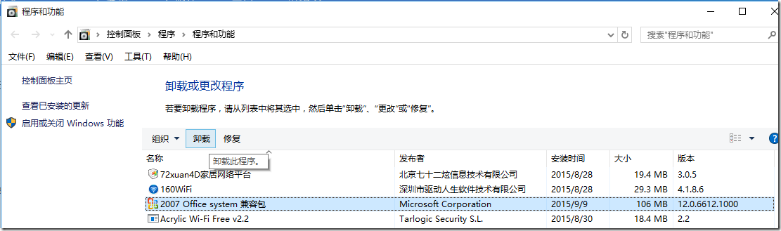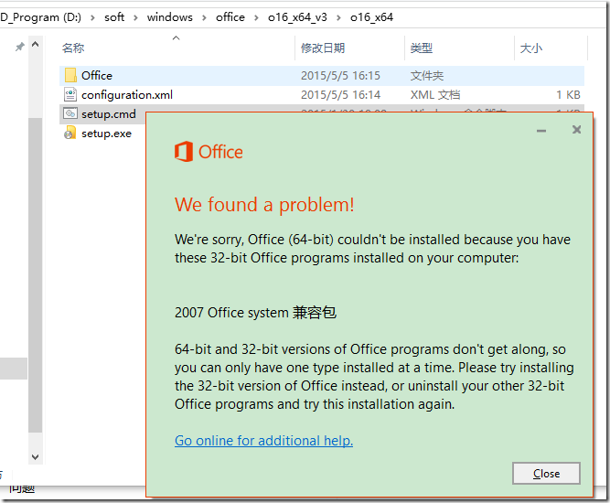 结果却由于我之前安装了32位的 2007 Office system兼容包而无法安装: