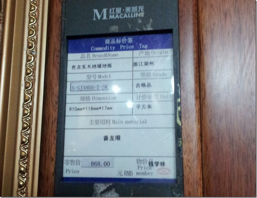 接着就是,去了苏州横塘红星美凯龙的柏尔地板店面中去看,结果发现花梨木的,标价是1800前后的。。。所以,即使老田可以帮忙拿到再低的价格,估计也得在1000,800以上,所以直接放弃。。。;