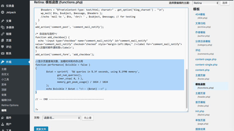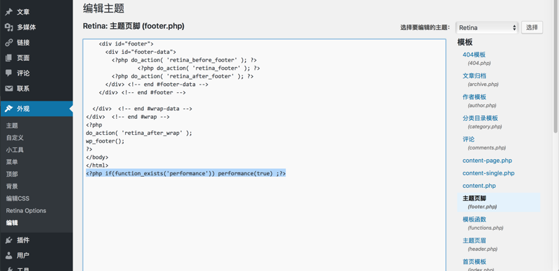 给wordpress网站,去添加测试加载速度和资源的代码: