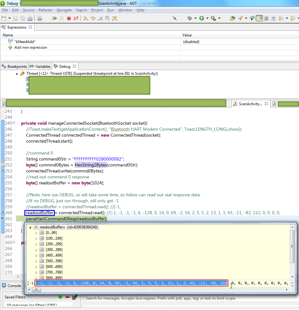 readoutBuffer = connectedThread.read(); //[-1, -1, -1, -1, 6, -128, 0, 14, 0, 69, -2, 54, 2, 5, 5, 2, 13, 1, 3, 43, -11, -82, 122, 0, 0, 0, 0,