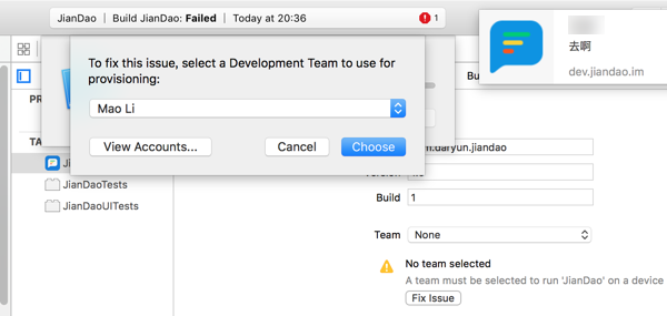 No team selected: A team must be selected to run ‘JianDao’ on a device