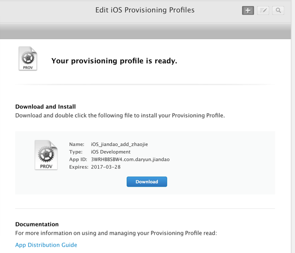 刚才在网页中生成新的provision profile时,即可看到download的按钮,点击下载到本地
