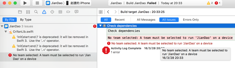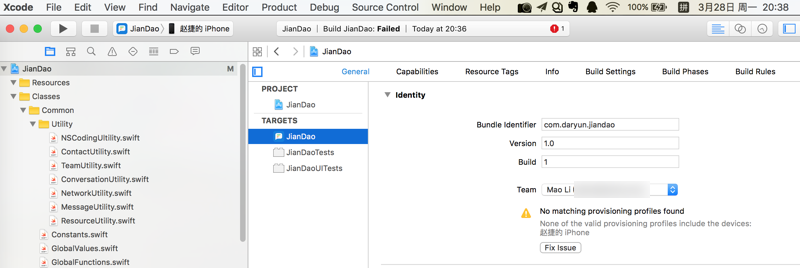 然后尝试编译,点击弹出的provisiong问题的Fix issues