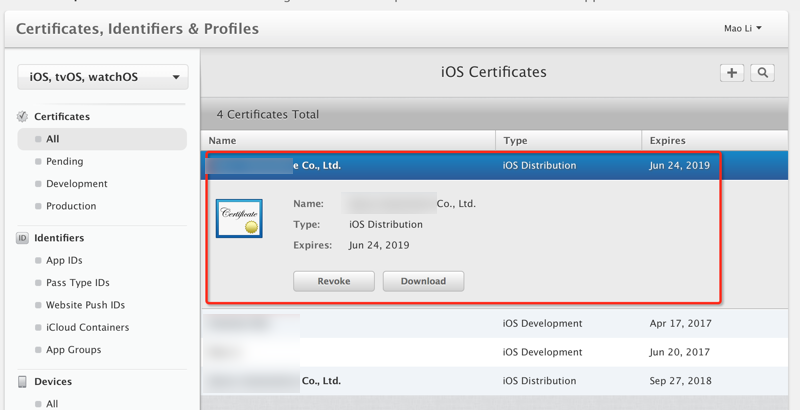 然后此处,自己用自己的Team Admin的账号去重新创建一个证书后,下载并安装到了本地Mac中(的钥匙串)