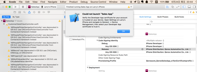 Could not launch “Sales App” Verify the Developer App certificate for your account is trusted on your device. Open Settings on Larry’s iPhone and navigate to General -> Device Management, then select your Developer App certificate to trust it. |