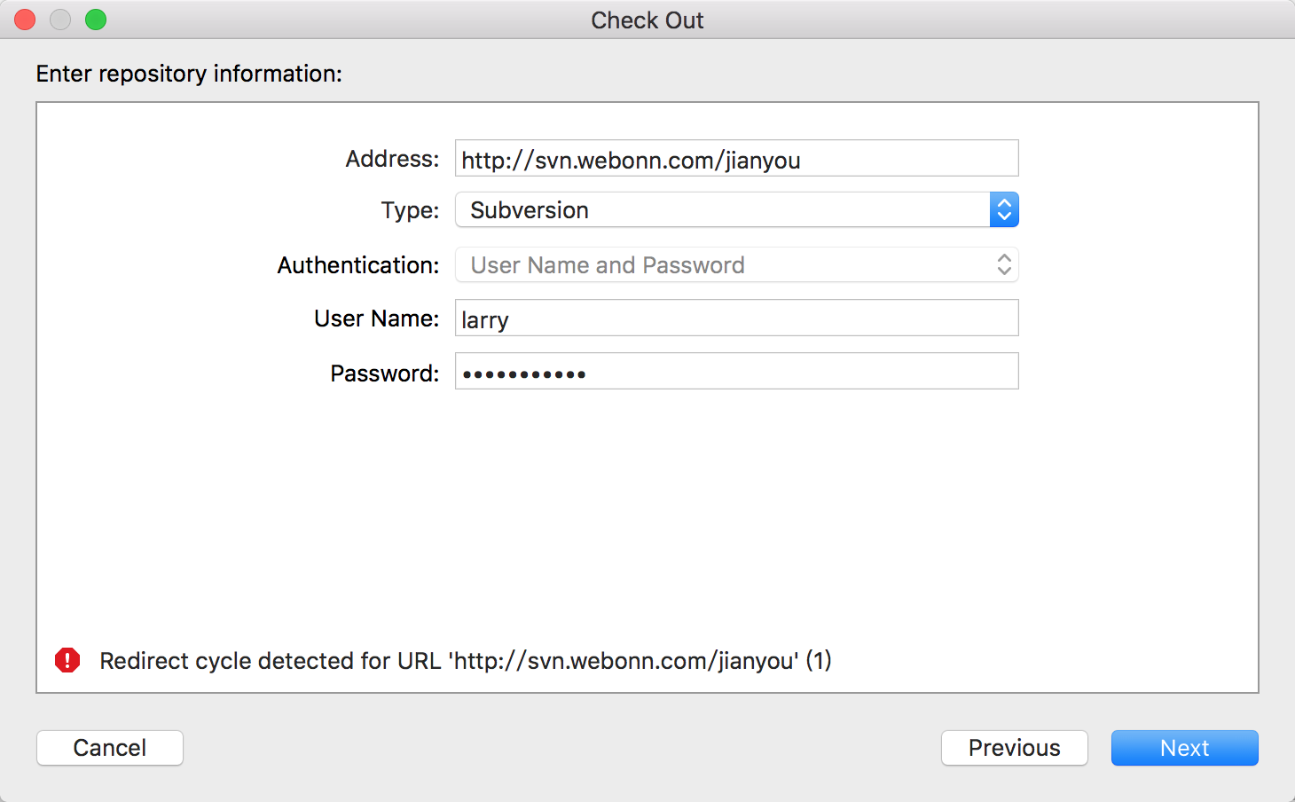 licrifandeMacBook-Pro:ref_project crifan$ svn co –username xxx svn://svn.webonn.com/jianyou Authentication realm: <svn://svn.webonn.com:3690> 68140004-c8b1-40bc-910f-afd50bd3112f Password for ‘xxx’: |
