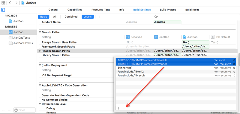 而现在不需要对应的framework后,应该去去掉这些路径,即可消除编译警告。