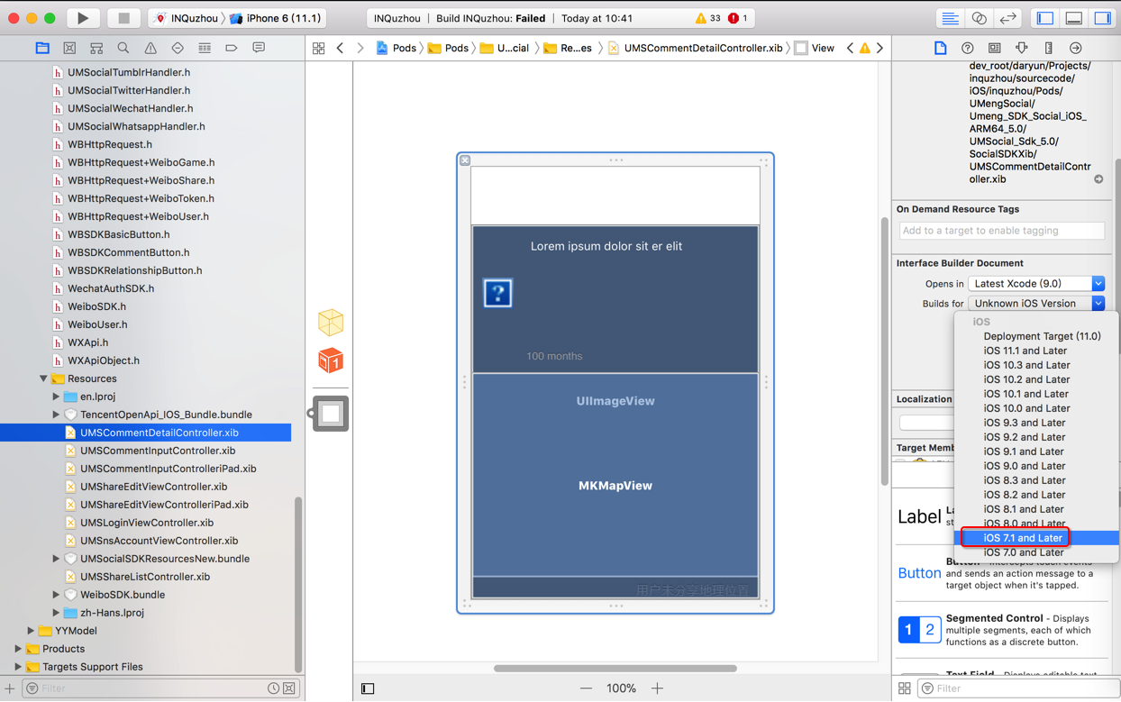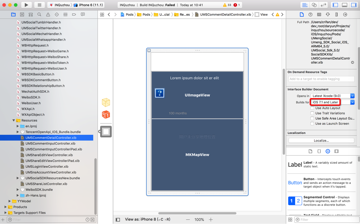 /Users/crifan/dev/dev_root/daryun/Projects/inquzhou/sourcecode/iOS/inquzhou/Pods/UMengSocial/Umeng_SDK_Social_iOS_ARM64_5.0/UMSocial_Sdk_5.0/SocialSDKXib/UMSCommentDetailController.xib:global: error: Compiling IB documents for earlier than iOS 7 is no longer supported. [12]
