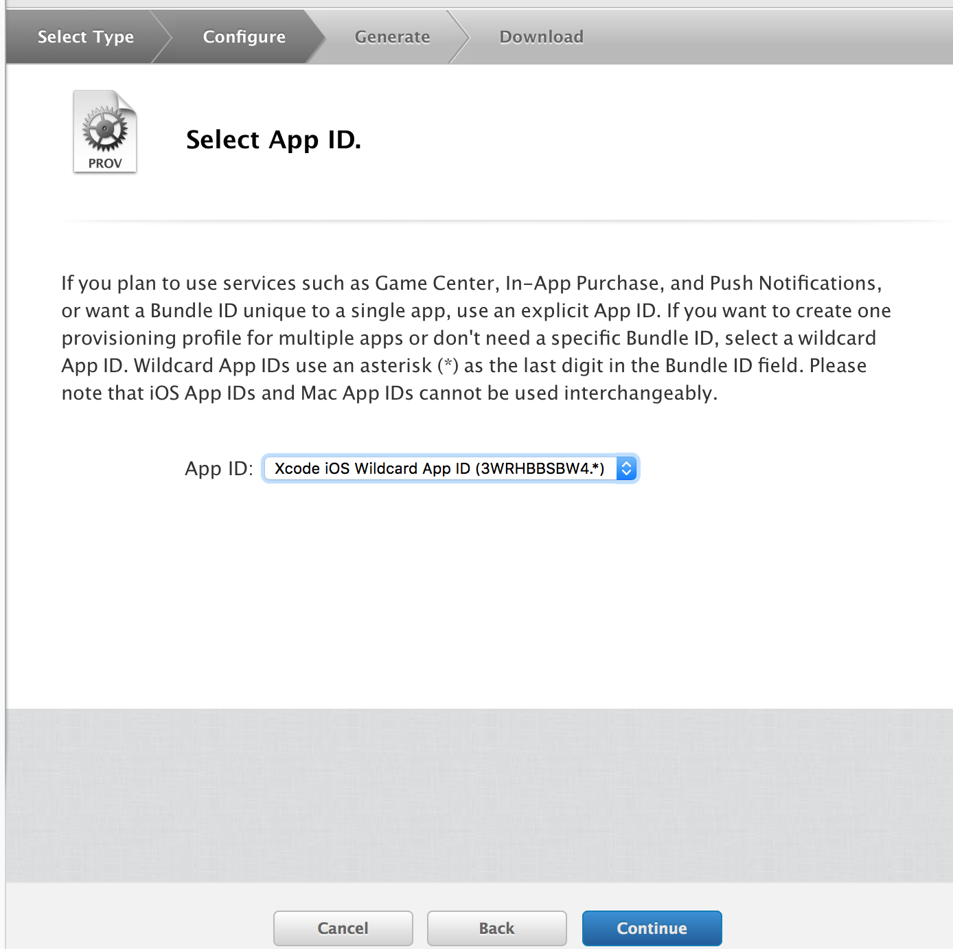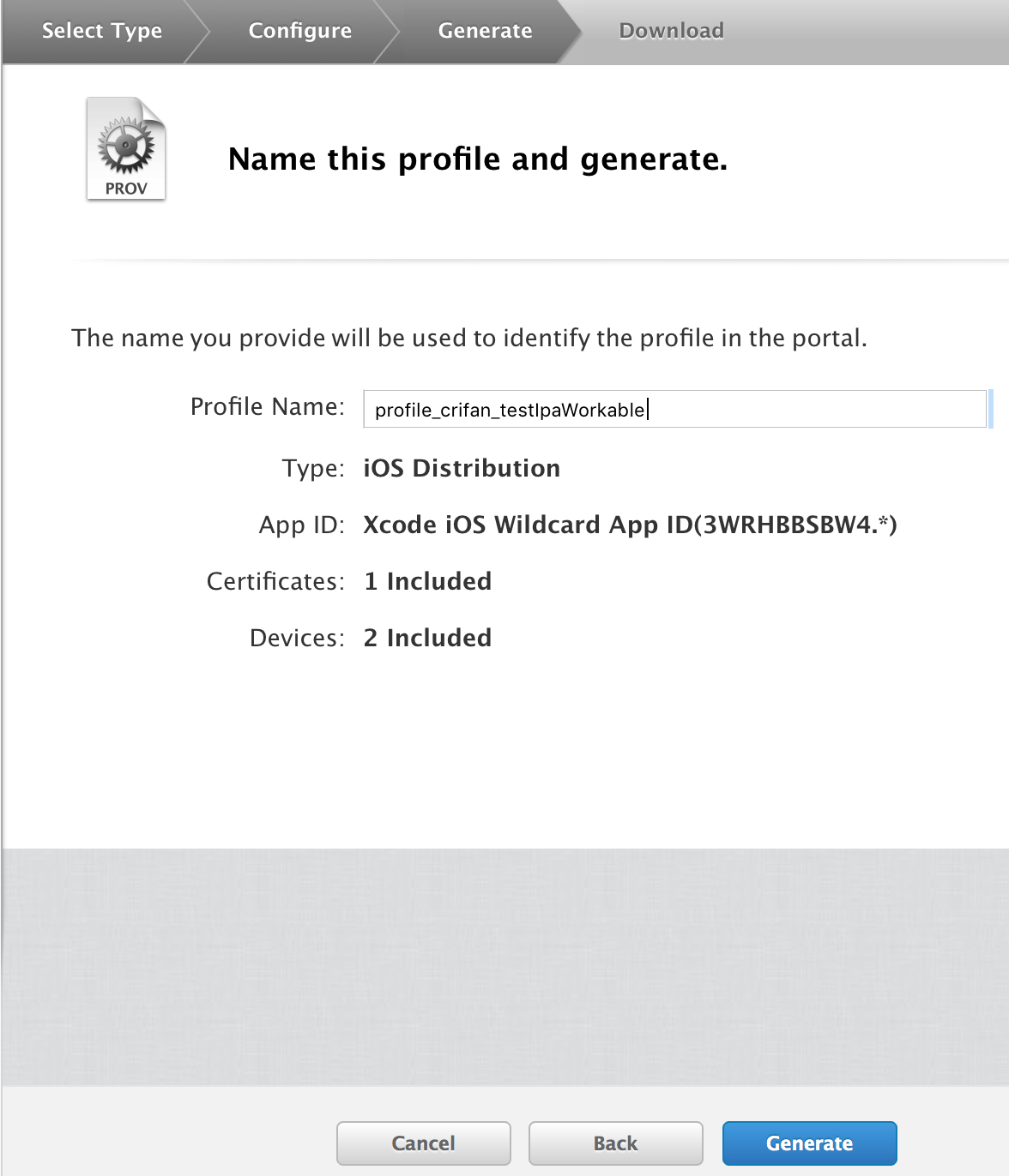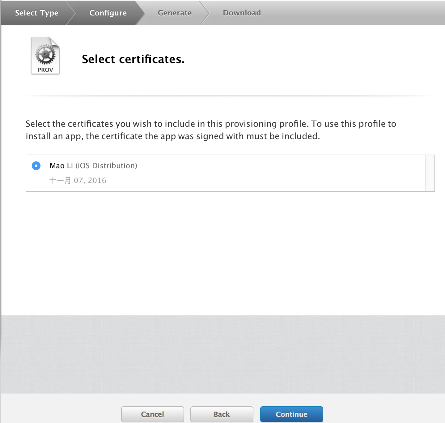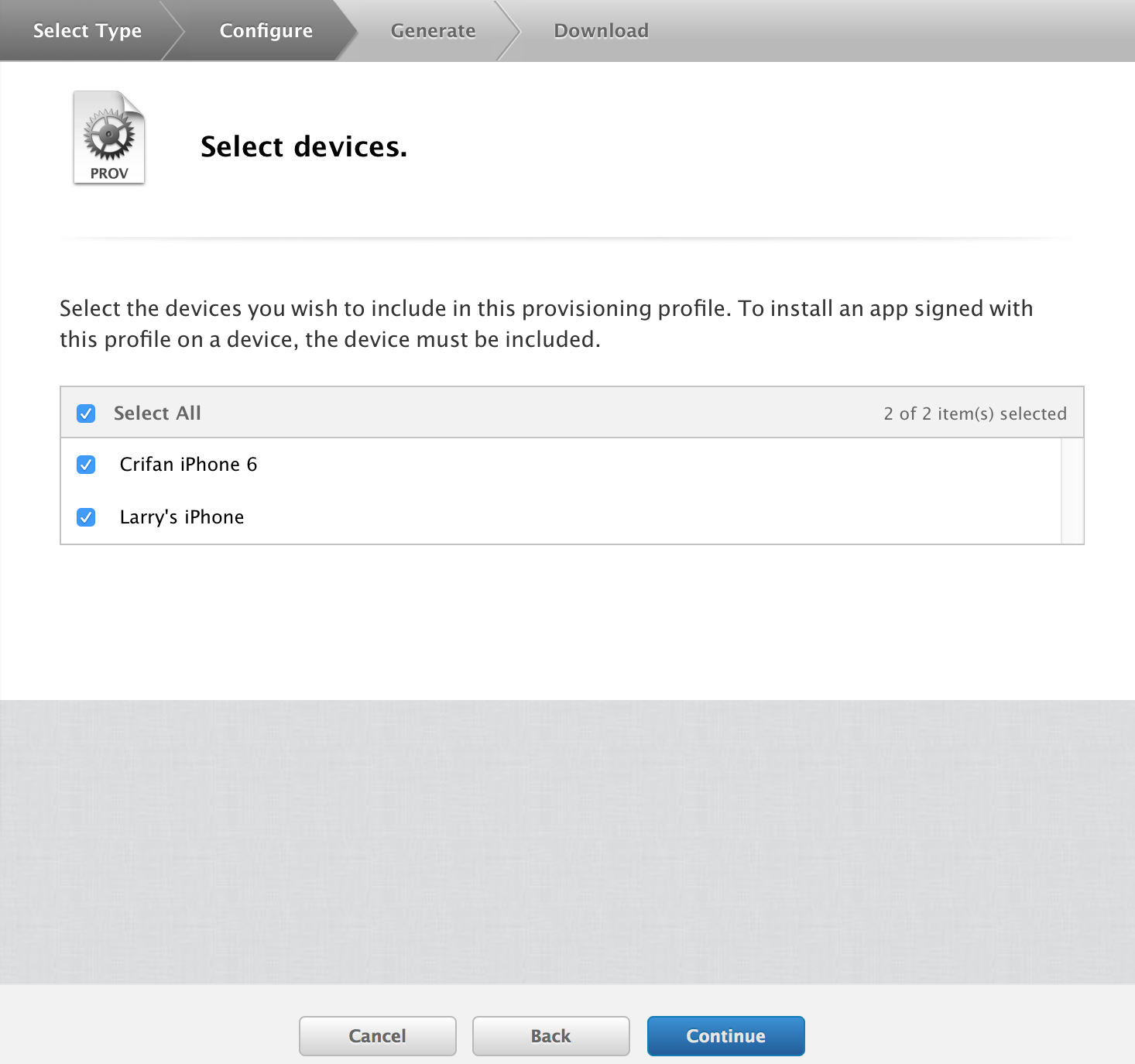 然后选择对应的,之前已经注册过了的iOS设备: