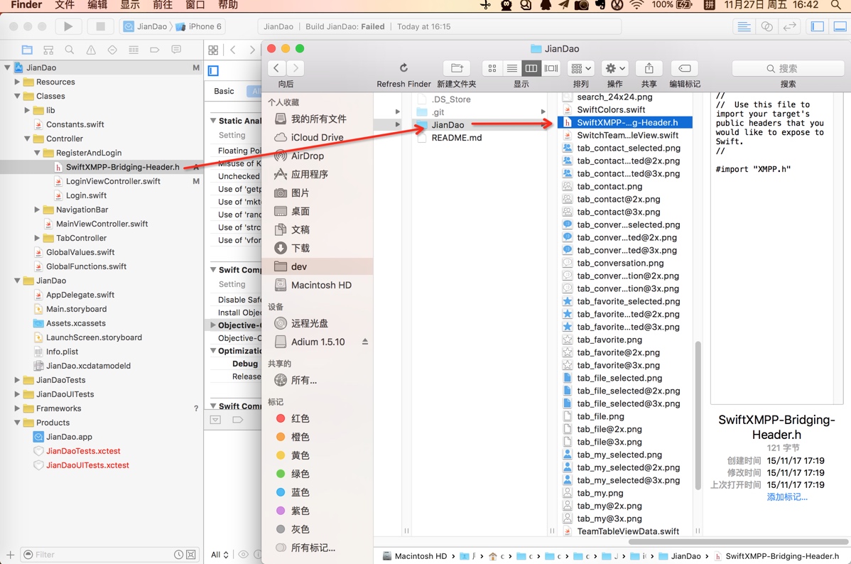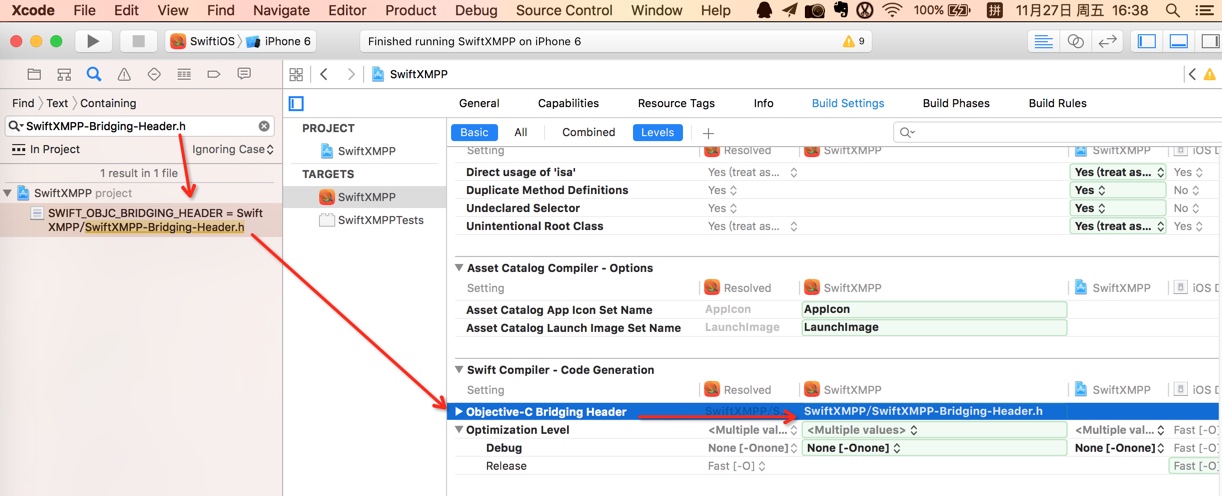 2.然后,在Swift的项目属性中的,添加此头文件作为Object-C的桥接头文件