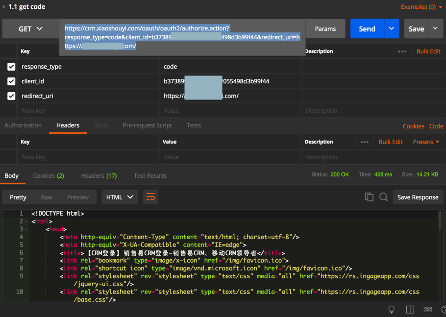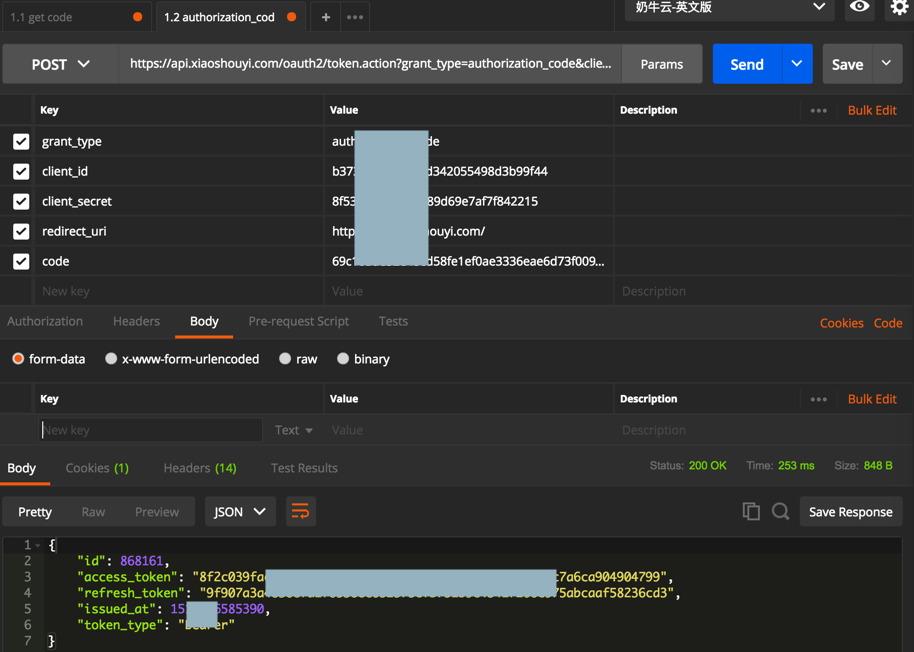 POST https://api.xiaoshouyi.com/oauth2/token.action?grant_type=authorization_code&client_id=b3xxxf44&client_secret=8fxxx215&redirect_uri=https://xxx.xiaoshouyi.com/&code=69c1xxxb9