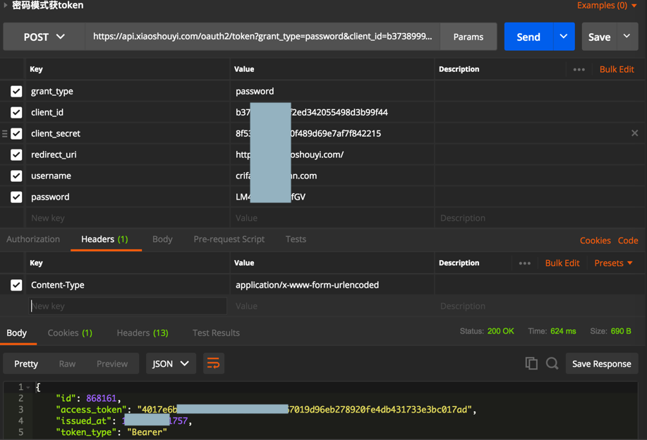 https://api.xiaoshouyi.com/oauth2/token?grant_type=password&client_id=b3xxx4&client_secret=8fxxx15&redirect_uri=https://xxxoshouyi.com/&[email protected]&password=LMxxxV