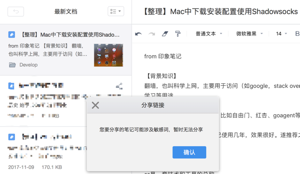 最开始,在Mac端的有道云笔记中,分享了一个关于shadowsocks的帖子给了别人。